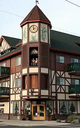 A glockenspiel is installed at 190 E. Charles Street in Mt. Angel, Oregon, United States.[1] The glockenspiel is housed in a 49-foot (15 m) tower and features wood carvings of community members. A musical routine occurs four times daily.[2]