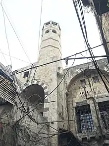 The Mu'allaq Mosque is a mosque in Tripoli, Lebanon. It was commissioned by the Ottoman governor of Tripoli Mahmud Lutfi al-Za'im and constructed in 1559[1][2] in the early time of Ottoman Syria under Suleiman the Magnificent. Its name means "hanging mosque" originating in the location of the mosque in the first floor of a structure partly roofing a street.[3] Steps lead up to the entrance of the mosque. Above the door, a foundation inscription on stone is installed mentioning the completion of the mosque in Rabi' al-Awwal of AH 969 (November/December 1561).[4] The mosque has an octagonal minaret that is decorated by two bands of black stone. The minaret is crowned by two levels having a balcony each, the eight windows of the lower balcony are roofed by pointed arches. Next to the mosque, there is a garden that can be reached by steps.[1] The garden is the location of the Mausoleum of Mahmud Lutfi al-Za'im.