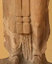 A statue of Mudgarpani ("Mace-holder") Yaksha from Bharana Kalan, visible in the Mathura Museum, is dated to circa 100 BCE.[11] It was discovered in Bharana Kalan, 32 kilometers northwest of Mathura.[11] In the right hand he holds a mudgar mace, and in the left hand he used to hold the figure of a small standing devotee or child joining hands in prayer.[12][2][6]