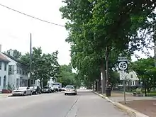 After the intersection with the latter, the route becomes a four-lane undivided road, entering Woodbury and immediately crossing the Southern Railroad of New Jersey's Salem Branch line at-grade.[1] The road crosses Conrail Shared Assets Operations' (CSAO) Penns Grove Secondary railroad line at-grade before coming to an intersection with CR 551. Here, Route 45 forms a concurrency with CR 551 and heads north-northeast on Broad Street through the downtown of Woodbury, where it intersects CR 663. Route 45 and CR 551 cross the Woodbury Creek out of the downtown area and intersect CR 644 near Inspira Health Center Woodbury.[1][2] From here, the route continues past a mix of residences and businesses as a two-lane undivided road.[2] CR 551 splits from Route 45 by heading east on Park Avenue then north on Broadway.[1]