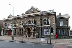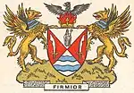 Granted on 1 September 1932, the borough's coat of arms was: Per saltire argent and gules in chief a representation of St. Nicholas proper in base two bars wavy azure and in fesse as many seaxes (Saxon swords) the cutting edges inwards proper pommels and hilts or. Crest : Issuant out of a Saxon crown or a phoenix sable in flames proper. Supporters : On either side a griffin or gorged with a collar gemel wavy azure.[1]