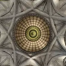 The building is known for its 255 ft (77.7 m) tall tower. The chief architectural feature is the central dome that rises to a height of 71.5 m (234.6 ft).[1] The gable has a huge winged allegorical figure representing the 'urbs prima in Indis', the first city of India as it was to be known then. The richly molded and paneled Council Chamber has a ceiling of unpolished teak. Records also support that at these environs Phansi Talao or Gallows Tank, where public hangings took place, was located.[7][10][11] In the period from 1100 to 1500 AD, the architecture of churches constructed with ornamental arches, with ribs supported by buttresses resulted, in the subsequent idea of the framed structural design with grandeur and monumentality during the renaissance period of 1500–1700 AD, as the distinct style; the Mumbai Municipal Corporation building, Chhatrapati Shivaji Maharaj Terminus, the Rajabai tower and the University of Mumbai are some examples of this style. The old style of dome construction was also revived and became popular; 1750 onwards was considered to be the period of modern architecture.[12] The Gothic architecture with controlled composition custom–made to the climatic extremes of the city has cusped window arches and elaborately domed corner towers.[13]
