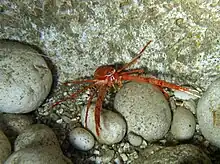 Munida rugosa is orange with transverse bands of darker colour on the carapace and abdomen. It is up to 10 centimetres (3.9 in) long but like other members of the genus, it folds its abdomen beneath its cephalothorax. The carapace including the rostrum is about 30 millimetres (1.2 in) long. The carapace has a few spines on the back edge and the rostrum has a single central spine, flanked by two shorter spines above the eyes.[3] The thread-like antennae are slightly shorter than the first pair of appendages which are tipped by long narrow white pincers. The next three pairs of limbs also have white tips and are used for walking. The fifth pair is particularly thin and is usually held underneath the margins of the carapace.[4] The eyes are relatively small in this species and the morphology varies over its range. More southerly specimens are more spiny, have more setae on the abdomen and have longer, more slender limbs.[2]