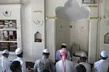 The Munshibari Jama Masjid was established in the region as local Muslims had nowhere to pray. It was completed in British India, in 1891 by Huss'eyn ud-Din Munshi alongside a pond owned by the Munshibari family. Built by local masons, the structure is of Indo-Saracenic and Indo-Islamic blend. It has four minarets (or manārah مناره) in four corners of the structure, a hall way, the Mihrab (محراب) in the main prayer room (musallah). The Mihrab also has a Minbar (منبر) for regional khatibs (خطيب) to deliver sermons (khutbah; خطبة) The exterior has a corridor by the pond for ritual purification (Wudu; الوضوء). The stairs lead to the top of the mosque. The structure also houses a living quarter for the Islamic scholars, and carved in library in the main hall for scriptures used during Madrasah (مدرسة) lessons. Since the late 19th century, the Imams (أئمة) and Muezzins (مؤذن) called on the local Muslims to the congregational mosque (then known as the Munshibari Masjid), where Jumu'ah (صلاة الجمعة) or weekly Friday noon (Dhuhr; صلاة الظهر) congregation prayers took place.