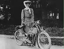 Hind later said she took up motorcycling because she "thought she would like to".[5] Her first motorcycle was a Singer, basically a motorised dropped frame bicycle, with a 2hp Motor Wheel added to the back wheel. The design was developed by Edwin Perks and Frank Birch of Coventry.[6]