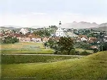 On the initiative of Emanuel von Seidls, the site of Murnau changed completely at the start of the 20th century. In 1908 two pairs of artists (Gabriele Münter[5] and Vassily Kandinsky;[6] and Marianne von Werefkin[7] and Alexej Jawlensky[8]) stayed in Murnau at the same time to paint together.[9] Through their pictures of Murnau and its scenery, which they continued to paint until 1914, the market town became famous to a worldwide art audience. In the history of art, this period before the First World War is called the "Murnau Era".