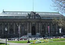 The façade is decorated with sculptures by Paul Amlehn: an allegory of the arts, depicting painting, sculpture, drawing and architecture, is mounted on the triangular gable above the entrance, and two more allegories, of archaeology and applied art, can be seen in the left- and right-hand corners of the building respectively. The upper frieze includes the names of Genevan artists: Dassier, Baud-Bovy, Saint-Ours, Agasse, Töpffer, Liotard, Calame, Diday, Menn, Petitot, Arlaud and Pradier.[2]