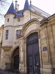 The Hôtel de Soubise was first built in 1371 as the Hôtel de Clisson and later acquired by the Ducs de Guise. In 1705, it was rebuilt by architect Pierre-Alexis Delamair (1676–1745) for François de Rohan-Soubise and Anne de Rohan-Chabot, with little remaining of the original structure but its turreted medieval gateway which is now the only surviving remnant of Parisian private architecture from the 14th century (see image).[2] The adjoining Hôtel de Rohan was built at the same time. In 1808, both buildings were acquired by the state, after which Napoleon designated the Hôtel de Soubise for the Empire Archives and the Hôtel de Rohan as the National Printing House (which so remained until 1927).