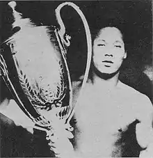 A lean and handsome wrestler, Musashiyama was popular with tournament crowds.[2] His picture sold more copies than any other wrestler.[1] Fighting alongside other popular rikishi such as Tamanishiki, Minanogawa, and his stable mate, sekiwake Tenryū, Musashiyama was expected to become a figurehead of the sumo world for years to come.[1] Two major events, however, had a severe impact on his career. He injured his right elbow in the October 1931 tournament, which reduced his power and never healed properly.[1] Then in January 1932 he was promoted from komusubi to ōzeki, but in the same month Tenryū and many other top wrestlers went on strike against the Japan Sumo Association, demanding reform of the organization, in what was to become known as the Shunjuen Incident. Musashiyama was criticized for his lukewarm support of the strike, but he never felt close to Tenryū's group.[3] In addition, several people insisted that the reason for Tenryū's walkout was his jealousy of Musashiyama's fast promotion to ōzeki while he remained at sekiwake.[3] Musashiyama had been considering giving up sumo altogether and turning to boxing instead, but eventually decided to stay in the Sumo Association.[3]