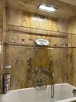 The first-floor bathroom, in which the original bath is still visible, presents a luminous space decorated with large yellow Siena marble slabs on the walls, with a floor of black African marble. A barrel-vaulted ceiling is adorned with stucco craftsmanship depicting the majestic presence of a Triton.[25] The bathtub, still featuring its original taps, was installed within a niche under a recessed glass ceiling light embellished with decorations inspired by marine themes.