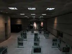 The underground museum is part of a master plan that includes a multimedia projection theater, an amphitheater, three water pools, Shikha Chirantony (eternal flame) symbolizing the eternity of Bengali nationalism, a mural based on the struggle for independence and other ancillary facilities.[2] There is also a 155-seat auditorium in the complex.[3] The focal point in the experience of the space is the monument, Tower of Light which is a 50-meter high tower composed of stacked glass panels.[3] The museum is situated beneath the tower of light.[4] The museum's plaza area has a 5669 square meter of tiled floor.[4] Its underground terrace has a fountain at the center where water is falls from over the ceiling. Bangladeshi architects Kashef Mahboob Chowdhury and Marina Tabassum won a national design competition in 1997 and subsequently they were commissioned for the project.[5] The total construction cost of the complex was 1.75 billion tk.[6][7]