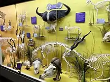 The museum offers many exhibits from all five vertebrate classes. There are also floating exhibits throughout the museum and whales hanging from the ceiling.[19] All the specimens on display are cleaned at the Skulls Unlimited building next door, using dermestid beetles.[20] The skeletons are articulated and then put on display.[21] The exhibits display a wide range of topics, including locomotion, adaptation, and forensic osteology and pathology.[9][22] The museum offers scavenger hunts for all ages. The answers to these can be found throughout the exhibits. The "Explorers Corner" is the section of the museum devoted to hands-on activities for children. There is a mystery skull game where children can touch real animal skulls.[9] They can also dissect owl pellets on the first floor or in the classroom.