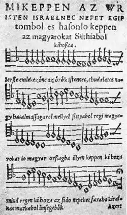 The 16th century saw the rise of Transylvania, a region the Turks never occupied, as a center for Hungarian music,[2] as well as the first Hungarian publications of music, both published in Kraków. István Gálszécsi's songbook was the "first Hungarian gradual to the Gregorian hymn-melodies and German choral music of which we can see new Hungarian translations", while the Cronica of András Farkas includes the first surviving historical song.[3] About forty melodies are known from this era, and are already in a distinctively Hungarian style which took influences from across much of Europe in several dozen distinct forms that were "mostly notated in a rigid and clumsy way" but were "undoubtedly much more colourful and flexible in living performance" and were in reality "little masterpieces of melodic structure".[3] The most significant musician of this period was Sebestyén Tinódi Lantos, the "greatest stylist and master of expression of ancient Hungarian epic poetry... whose heritage the people's music of two centuries was unconsciously nourished".[3]