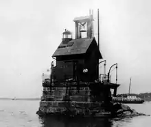 The shoals in this area were already marked by a stone daybeacon when the lighthouse board recommended construction of a light in 1871.[2] This followed some years of unsuccessful attempts to replace the lightship at Hog Island Shoal with a fixed light (the two shoals forming the edges of the channel leading into Mount Hope Bay).[3] Appropriation was made in 1873 and the first light was activated in August of the same year.[2] The form of the structure remained essentially the same over the years: a small square house with a lantern and fog bell set on the roof, all perched on a pier of stone blocks scarcely larger than the house itself. The building, however, had to be rebuilt or massively repaired several times over the years, due to damage from moving ice.[2] Damage to the pier in the winter of 1875 (the whole structure was shifted some four feet) led to enlargement of the pier in 1878, with the house being temporarily relocated to shore.[3] In 1920 the pier was again damaged by ice,[2] and four years later the house was rebuilt, the original single room dwelling being enlarged to four rooms.[3]