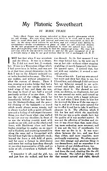"My Platonic Sweetheart" is a short dream narrative written by American writer Mark Twain. It was originally titled "The Lost Sweetheart" and written during July and August 1898. It was published more than two years after Twain's death, in the December 1912 issue of Harper's Magazine.[2] The main character (believed to represent Twain) has several dreams throughout his life about the same woman.[3] The narrative depicts five of these dreams, and in each dream the main character and the woman take on different names. The woman's appearance (hair and eye color) also changes in each dream. However, the characters' ages in the dreams remain the same, he is seventeen and she is fifteen, and the two characters never fail to recognize each other.