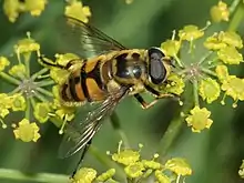 Myathropa florea, sometimes referred to as the Batman hoverfly,[2][3][4] is a very common European and North African species of hoverfly. Adults may be seen on flowers from May to September. It is of a similar size to the common drone fly (Eristalis tenax), but Myathropa are generally more yellow, with two light bands to the thorax, interrupted with a black central smudge. In museum specimens, any yellow colour soon fades to brown after death. Like most species in the tribe Eristalini, Myathropa are rather variable in size, shape and colour.