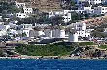 The Mykonos windmills are an iconic feature of the Greek island of the Mykonos. The island is one of the Cyclades islands, which neighbour Delos in the Aegean Sea. The windmills can be seen from every point of the village of Mykonos, the island's principal village, which is frequently called the Chora (which translates to "Country" in Greek, but refers to an island's "Town") on Greek islands. The windmills are the first thing seen when coming into the harbour of Alefkandra, as they stand on a hill overlooking the area. Most windmills face towards the North where the island's climate sources its strongest winds over the largest part of the year. There are currently 16 windmills on Mykonos of which seven are positioned on the landmark hill in Chora. Most of them were built by the Venetians in the 16th century, but their construction continued into the early 20th century. They were primarily used to mill wheat. They were an important source of income for the inhabitants. Their use gradually declined until they ceased production in the middle of the 20th century. The architecture of each of them is similar, all have a round shape, white colour and a pointed roof and very small windows. Such windmills are found in almost all Cyclades islands. One of these windmills has been transformed into a museum. The whole village of Chora and part of the harbour are visible from this point.