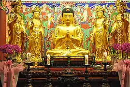 - South Chungcheong Tangible Cultural Property No. 185 Wooden Sakyamuni Buddha Triad in the Main Buddha Hall