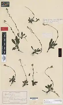 The lectotype specimen of Myosotis laeta was collected by Thomas Cheeseman from Red Hills, Wairau in 1882 and is lodged at the Auckland War Memorial Museum Herbarium (AK 7531).[4][6] There is also an isolectotype there (AK 210594)[7] and another at the Museum of New Zealand Te Papa Tongarewa (WELT SP002415).[4]