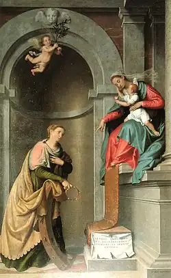 Mystic Marriage of Saint Catherine or Mystic Betrothal of Saint Catherine is a 1567-1570 oil on panel painting by Giovanni Battista Moroni, produced for the side-altar of Catherine of Alexandria in the church of San Bartolomeo, parish church of Almenno San Bartolomeo, where it still hangs. It is signed at lower right IO:BAP.MORONUS.P.[1] The church had been begun in 1520 through the will of Giorgio Rota, but work lapsed until restarting in 1562. The painting draws on the composition of Moretti's 1539 Rovelli Altarpiece.