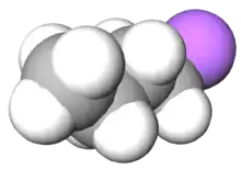 In n-Butylsodium, the Na-C bond has ionic character, with a negative charge on the end carbon atom. n-Butylsodium is insoluble in saturated hydrocarbons. It reacts with unsaturated hydrocarbons.[3] Soluble adducts are produced with Lewis bases such as tetramethylethylenediamine or tetrahydrofuran.[2]