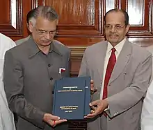N.R Madhava Menon presenting report of the committee on draft National Policy on Criminal Justice to the 25th Home Minister of India Shivraj Patil in New Delhi 2007.