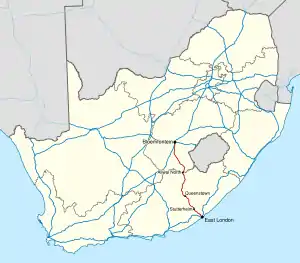 The N6 is a national route in South Africa that connects East London with Bloemfontein, via Komani and Maletswai.[1] It runs roughly from north to south, connecting the N1 with the N2.