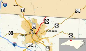 North Carolina Highway 104 (NC 104) is a primary state highway in the U.S. state of North Carolina. It connects northeast Surry County with downtown Mount Airy following Riverside Drive.