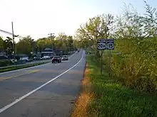 While NY 15A heads due north from Springwater toward Hemlock Lake, NY 15 leaves Springwater to the west, climbing out of the valley and snaking its way northwestward through the hills of the Southern Tier to the town of Conesus. At the hamlet of Conesus, NY 15 connects to County Route 71 (CR 71),[4] formerly designated as NY 255.[5] Past Conesus, the route continues northward across rolling, rural terrain to the village of Livonia, located in the town of the same name. NY 15 veers northeastward as Commercial Street for three blocks to Main Street, which carries the east–west US 20A through the village. Here, NY 15 turns west onto Main Street, joining US 20A on a 2.5-mile (4.0 km) overlap along Main Street and Big Tree Road that takes both routes into the adjacent hamlet of Lakeville, located at the northern tip of Conesus Lake. The two routes split in the center of the community, where US 20A continues west towards Buffalo while NY 15 turns north towards Rochester.[4]