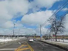 Approaching State Fair Boulevard on NY 297 northbound. The New York State Fairgrounds are located adjacent to the intersection.