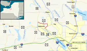 New York State Route 631 (NY 631) is a north–south state highway in Onondaga County, New York, in the United States. It serves as a bypass around the village of Baldwinsville, extending for just over 5 miles (8.0 km) from an intersection with NY 370 in the southeastern part of the village to a junction with NY 48 and NY 690 just north of Baldwinsville in the town of Lysander. The route has a short overlap with NY 31 east of the village. Most of the route is two lanes wide and passes through rural areas around the edge of Baldwinsville, while a part near the Lysander community of Radisson is four lanes wide and serves residential and commercial neighborhoods.