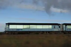 In 1942 two Guard's vans were built on the same 56 ft (17.07 m) type underframe to create vans to match the 56-foot carriages.[8] The first two vans had narrow vestibules at both ends, and a further 19 vans built from 1943-44 only had this at one end.[9]