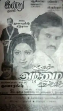 Naan Adimai Illai (transl.I am not a slave) is a 1986 Indian Tamil-language romantic drama film directed by Dwarakish. The film stars Rajinikanth and Sridevi. This was the last Tamil film for Sridevi in 1980s who then concentrated on her Bollywood career, though she would later return to Tamil cinema in the 2010s. Naan Adimai Illai ran for 75 days in all major cities and was a disaster at the box office.[1][2] The film was a remake of the Hindi film Pyar Jhukta Nahin (1985).
