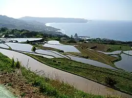 Nagato is located in northwestern Yamaguchi. The north side faces the Sea of Japan, and the coastline facing the open sea is eroded terrain. On the other hand, there are coves such as Fukagawa Bay and Senzaki Bay, which are surrounded by the island of Ōmijima and the mainland, and Aburaya Bay, which is surrounded by the Mukatsugu Peninsula, which are good natural harbors. Since the Mukatsugu Peninsula has little flat land, there are many terraced rice fields. The southern part of the city is on the western edge of the Chugoku Mountains, and snow can be seen in the mountainous areas. However, due to the influence of the Tsushima Current, it does not get extremely cold even in winter, and because the altitude is not so high, the number of snowy days is not so many. Nagato also encompasses Ōmijima Island in the Sea of Japan, which is connected by a large road bridge which connects the Senzaki Peninsula with the southern edge of the island. Much of the island is within the borders of the Kita-Nagato Kaigan Quasi-National Park.
