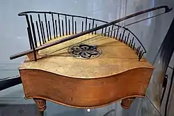 Wilde was inspired to create the instrument when he accidentally drew his bow across a metal peg, which produced a musical sound.[1] The instrument consists of a semicircular wooden soundboard, approximately 1.5 feet (46 cm) by 1 foot (30 cm) in size, with iron or brass nails of different lengths arranged to produce a chromatic scale when bowed; the deeper the nails are driven in, the shorter the nail and the higher the pitch.[1] The bow used was fitted with coarse black horsehair, which produced sound by friction. An improved instrument, now in the collection of the Hochschule in Berlin, has two half-moon sound-chests of different sizes, one on the top of the other, forming terraces. In the rounded wall of the upper sound-chest are two rows of iron staples, the upper giving the diatonic scale, and the lower the intermediate chromatic semitones.[3] The instrument has a sweet bell-like tone but limited technical possibilities.