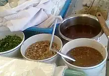 Nam tok-noodle ingredients in Thailand. The upper right pot has raw pig's blood that will be added to the noodle soup preparations