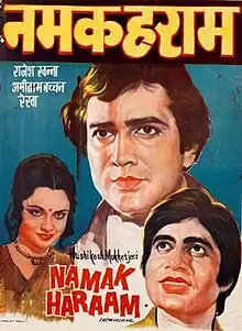 Namak Haraam (transl.โTraitor) is a 1973 Indian Hindi-language drama film directed by Hrishikesh Mukherjee. The music is by R.D. Burman, the screenplay by Gulzar, and lyrics by Anand Bakshi. The film stars Rajesh Khanna and Amitabh Bachchan. It also stars Rekha, Asrani, Raza Murad, A. K. Hangal, Simi Garewal and Om Shivpuri. Rajesh Khanna received his third BFJA Awards for Best Actor (Hindi) in 1974 for this film and Amitabh Bachchan had won his second Filmfare Award for Best Supporting Actor in 1974.