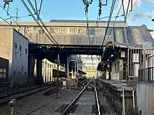 The station consists of single island platform and a single side platform serving three tracks, with the middle track on a passing loop, connected by an elevated station building built over the platforms and tracks.