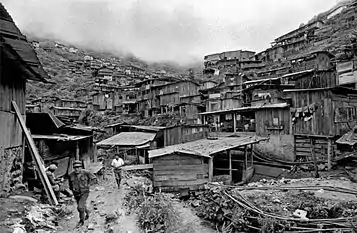 Then, on the afternoon of May 9, 1993, Mother's Day, a large part of the mountain at the end of the valley, above the mines and part of the town, collapsed. About 80 homes were destroyed, with an estimated 200-250 people living in them. (The link to the Houston Chronicle which used to be here is dead and was thus removed) A lot of the homes doubled as entrance shacks to the mines, and people working in there were buried. Rescue operations were difficult, since the site is so hard to reach. For the people there though, the disaster is just a part of their daily life. In the unaffected parts of the settlement, mining went on.