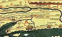 The river may have been mentioned for the first time in the 1st century AD by Roman historian Marcus Velleius Paterculus under the name Bathinus flumen.[3] Another basic source associated with the hydronym Bathinus is the Salonitan inscription of the governor of Dalmatia, Publius Cornelius Dolabella, where it is stated that the Bathinum river divides the Breuci from the Osseriates.[4] Some scholars also connect the Roman road station Ad Basante, first attested in the 5th century Tabula Peutingeriana, to Bosnia.[5][6] According to the English medievalist William Miller in the work Essays on the Latin Orient (1921), the Slavic settlers in Bosnia "adapted the Latin designation [...] Basante, to their own idiom by calling the stream Bosna and themselves Bosniaks [...]".[5] According to philologist Anton Mayer the name Bosna could essentially be derived from Illyrian Bass-an-as(-ā) which would be a diversion of the Proto-Indo-European root *bhoĝ-, meaning "the running water".[7] The Croatian linguist, and one of the world's foremost onomastics experts, Petar Skok expressed an opinion that the chronological transformation of this hydronym from the Roman times to its final Slavicization occurred in the following order; *Bassanus> *Bassenus> *Bassinus> *Bosina> Bosьna> Bosna.[7] Other theories involve the rare Latin term Bosina, meaning boundary, and possible Slavic and Thracian origins.[8][9] Theories that advocates the link of the name Bosnia, and thus of the Bosniaks with the Early Slavs of northern Europe has initially been proposed by the 19th century historians Joachim Lelewel and Johann Kaspar Zeuss, who considered the name of Bosnia to be derived from a Slavic ethnonym, Buzhans (Latin: Busani), mentioned in the Primary Chronicle and by the Geographus Bavarus in his Description of cities and lands north of the Danube. According to both Lelewel and Zeuss Buzhans settled in Bosnia.[10][11] The theory of Slavic origin of the name Bosnia and its possible connection with the Slavic tribe of Buzhans, came also to be advocated by the 20th and 21st century Yugoslav and Bosnian historians such as Marko Vego,[12] Muhamed Hadžijahić[13] and Mustafa Imamović.[14]
