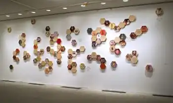 Macko's first large installation, Dance of the Melissae (1993, Brand Library & Art Center), presented a multi-sensory cosmology of wall reliefs, found-object sculpture and digital and handmade images employing sound, scent, taste and visuals to convey the feminine potency of nature, bees and regeneration.[6][34] The installation took the form of an ancient temple that she based on research into matriarchal cultures, women of the Bible and mythology; its elements included: imagery combining queen bees, bee priestesses, abstracted goddesses and the honeycomb form; eleven displays of bee-related objects perched on pedestals (Stations of the Goddess); a hexagonal floor sculpture made of wax and lead; and Honeycomb Wall, 98 panels containing objects, images and text related to honeybees and the geometry, chemistry and history of honey.[8][31][34][5]