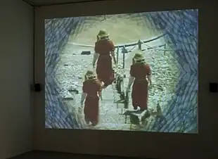 In two multidisciplinary video installations, Macko combined metaphorical, layered imagery and audio experimentation.[35][20] Lore of the Bee Priestess (1992–04) was a visual narrative portraying a newly awakened "bee priestess" attempting to recover the ancient power of a now-lost matriarchal culture indoctrinated by bees, which revered female creativity, nature and peace.[10][35][13] Presented as a trans-historical odyssey of both social and identity construction, it interwove Macko's characteristic bee imagery, symbolic objects and locations from around the world, and enacted rituals referencing feminine archetypes such as the mother, courtesan, Amazon and psychic.[10][35][13] In "Bee Stories" (2006), Macko created a fractured, kaleidoscopic effect, using hexagonal shapes inscribed with bee-related visuals and a soundtrack of ambient nature and stories about bees narrated in foreign languages that merged in a drone-like cacophony.[35][11] Reviews described it as a gentle immersion in unfamiliar cultures—temporally, back to an ancient lost utopia, and aurally, through its hypnotic soundtrack.[36][11]
