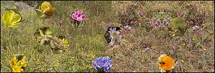 In "The Fragile Bee" project, Macko confronted human behavior and the ecological threats to bees due to colony collapse disorder—widely considered the result of persistent use of neonicotinoid pesticides in agriculture.[3][2][45] She established a garden for native bee-attracting plants, enabling her to document their stages of life throughout the year. These images became the "Botanical Portraits" suite (2014–15), which employed a compelling use of scale and hexagonal facet inserts that framed details, creating perceptual shifts of space, time and attention.[45][3] The billboard-scaled work Meadow depicted the near-abstract blur of color and texture of a distant field of wildflowers punctuated with facets of particularized, magnified moments—e.g., a bee entering the recesses of a flower—revealing the complexity of dynamic organic processes.[45][46][2] These works were part of "The Fragile Bee," initially presented at the Lancaster Museum of Art and History in 2015, and subsequently at sixteen venues throughout the US as of 2023, including the Hilliard Art Museum and Peggy Notebaert Nature Museum (Chicago).[2][47][48][3] The exhibition also included video and the 105-panel mixed-media installation, Honey Teachings: In the Mother Tongue of the Bees.[45][3]