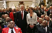In a relative surprise, the Democratic Party lost three seats in the 2004 House elections, which coincided with Bush's reelection as president.[38] Focused on retaking the House majority in 2006, in her second term as minority leader Pelosi worked to criticize the Bush administration more effectively and to contrast the Democratic Party with it.[38][39] As part of this, Pelosi voiced even harsher criticism of Bush's handling of the Iraq War.[39] In November 2005, prominent congressional Democrat John Murtha proposed that the U.S. begin a withdrawal of troops from Iraq at the "earliest predictable date". Pelosi initially declined to commit to supporting Murtha's proposal.[40] Speaker Dennis Hastert soon brought to the floor a vote on a non-binding resolution calling for an immediate withdrawal of troops, seeking to trap Democrats into taking a more radical stance. But Pelosi led Democrats in voting against the resolution, which failed in a 403–3 floor vote.[41] Roughly two weeks later, Pelosi held a press conference in which she endorsed Murtha's proposal.[42] Some critics believed that Pelosi's support for a troop withdrawal would prevent the Democrats from winning a House majority in the 2006 elections.[39]