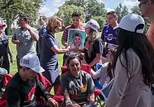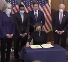 When Pelosi entered office, the AIDS epidemic was at a dire point.[22] San Francisco was greatly affected; its large population of gay men was the epidemic's initial epicenter.[23] Beginning in her first term, Pelosi became a prominent congressional advocate on behalf of those impacted by HIV/AIDS.[22] Shortly after she took office, she hired a gay man as her congressional office's director of AIDS policy. In her first floor speech, Pelosi promised that she would be an advocate in the fight against what she called "the crisis of AIDS." With great stigma around the subject, some in her party privately chastised her for publicly associating herself with it.[18] Pelosi co-authored the Ryan White CARE Act, which allocated funding dedicated to providing treatment and services for this impacted by HIV/AIDS.[22] President George H. W. Bush signed the bill into law in December 1990.[24]