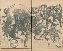 Bakin performed his research for the novel by referencing war tales about the Satomi clan and the Hōjō clan such as Satomiki (里見記), Satomi Kyudaiki (里見九代記) and Hojo Godaiki (ja:北条五代記).[6][7] While the Shogenjikō Setsuyōshū attests the existence of a historical "Eight Dog Warriors" in service of the Satomi clan, their lives are not detailed, nor have they been found in any other known records of the time, making the veracity of their existence unclear.[5][8] In the preface Bakin humorously claims that the true story of the Dog Warriors was revealed to him in a dream, but that he had forgotten most of the details by the time he wrote it down.[5]