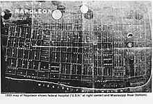 In 1852, Bolivar County established Wellington, Mississippi, as its county seat, nearly opposite Napoleon, on the east bank of the Mississippi River.[3] There would have been a natural rivalry between business and civic leaders in Desha County, Arkansas, and Bolivar County for river-related commerce at the confluence of the Arkansas and Mississippi rivers. From 1850 to 1860 the town had nearly doubled in population. Other nearby townships were recorded as using Napoleon's post office and the Marine Hospital had become the primary fixture of the town. While the population grew, floods levees were highly discussed but rarely constructed. Such levees were common work at other towns such as New Orleans and Baton Rouge but above the river at Napoleon an army report mentioned, "few or none had yet been attempted." Still the promise of levees had at least secured the building of the Marine Hospital.