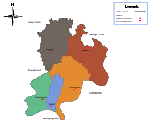 - ↑ Narayanganj, Fatullah, Baidyabazar, Rupganj and Araihazar upazilas of Dhaka district