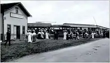 By September, the Boston Evening Transcript reported the opening of the railroad to Narragansett Pier "has had a marked effect on this very popular seaside resort", including the demise of the stagecoach previously used by visitors from points west or south.[3] The introduction of fast transportation to the resort town prompted a boom in construction of hotels and casinos.[4] Travelers from Providence could reach Narragansett Pier in approximately 80 minutes' time.[5]