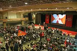 Senior figures in the Russian Presidential administration encouraged the formation of the group, which Moisés Naím labelled a government organized non-governmental organization (GONGO).[15] By late 2007, it had grown in size to some 120,000 members aged between 17 and 25. On April 6, 2012, the Nashi leader announced that the current form of the movement would dissolve in the near future, possibly to be replaced by a different organisation. He stated that Nashi had been "compromised" during the 2012 Russian presidential election.[16] In 2013, the organization ceased its activities and on December 2, 2019, the legal entity was liquidated.[17]